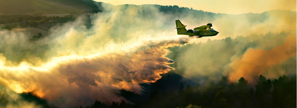 Ένα αεροσκάφος απελευθερώνει επιβραδυντικό πυρκαγιάς πάνω από μια πυρκαγιά, με καπνό και φλόγες να ανεβαίνουν από κάτω.