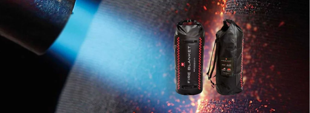 Δύο πυροσβέστες χρησιμοποιούν μια κουβέρτα πυρόσβεσης για να περιορίσουν φωτιά σε αυτοκίνητο, ενώ παχύς μαύρος καπνός υψώνεται από τις φλόγες.